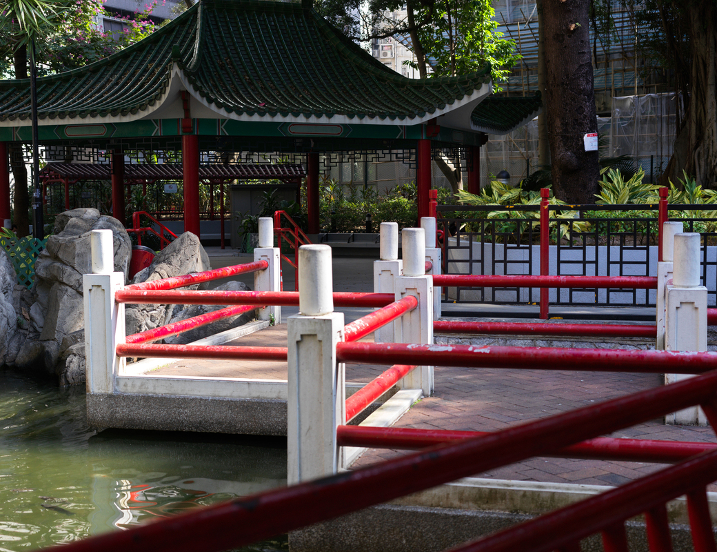 A pretty little garden with tiny pond full of colourful fish, small waterfall, pebbles for foot massage and elder go players.