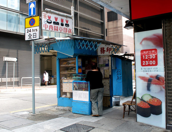 Hong Kong is a city of convenience, as you're never more than 100 metres away from a newspaper stand (sort of like a mobile newsagent). In some of the oldest streets of Central/Wan Chai, you'll find these types of metal kiosks each specialising in one service; key cutting, shoe shine, even Chinese pharmaceuticals. However this bright blue Stamp Kiosk was something I'd never seen before, a middle aged lady waiting to carve traditional chinese ceramic stamps as well as western rubber ones. Convenient or just random?