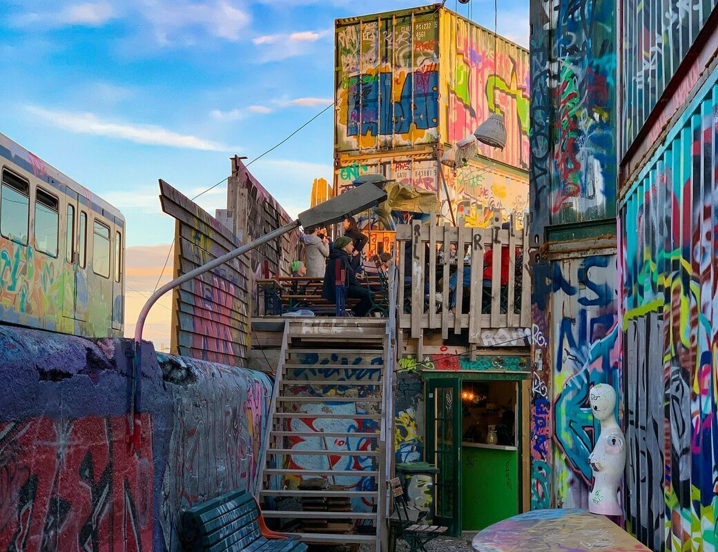 The Bahnwärter Thiel is an open air techno club and music venue filled with graffiti-ed containers, art installations and even a train coach. Think ‘colorful vibrant DIY apocalyptic steam punk’