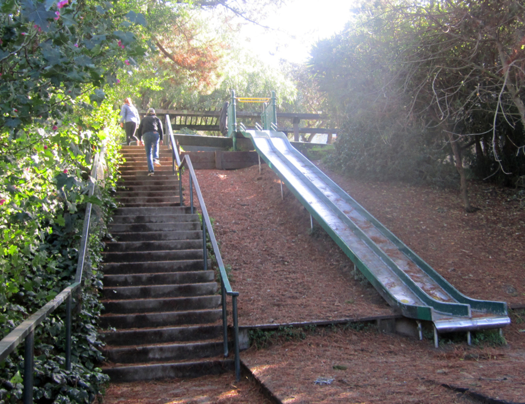 Some areas of San Francisco are so steep that the sidewalk literally is a stairway; other times it’s just more interesting to have a stairway between streets… or a slide. I once saw a grown man with a briefcase matter-of-factly go down this slide and continue on his way down the hill. Why not?