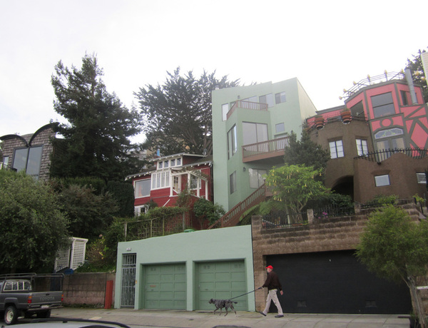 One day when I was walking around in the hills behind my house, I happened upon this bizarre street. It was as though someone had taken postmodernism and tried to make it into a block of houses. Each one has its own internally complete theme, involving strange colors and sculptural elements attached to the outside walls (gold eggs, wisps of wrought iron). This led me on subsequent walks to name them: the Corbusier House, the Barn, the Preschool Blocks house, the House of Wicca… and so on.